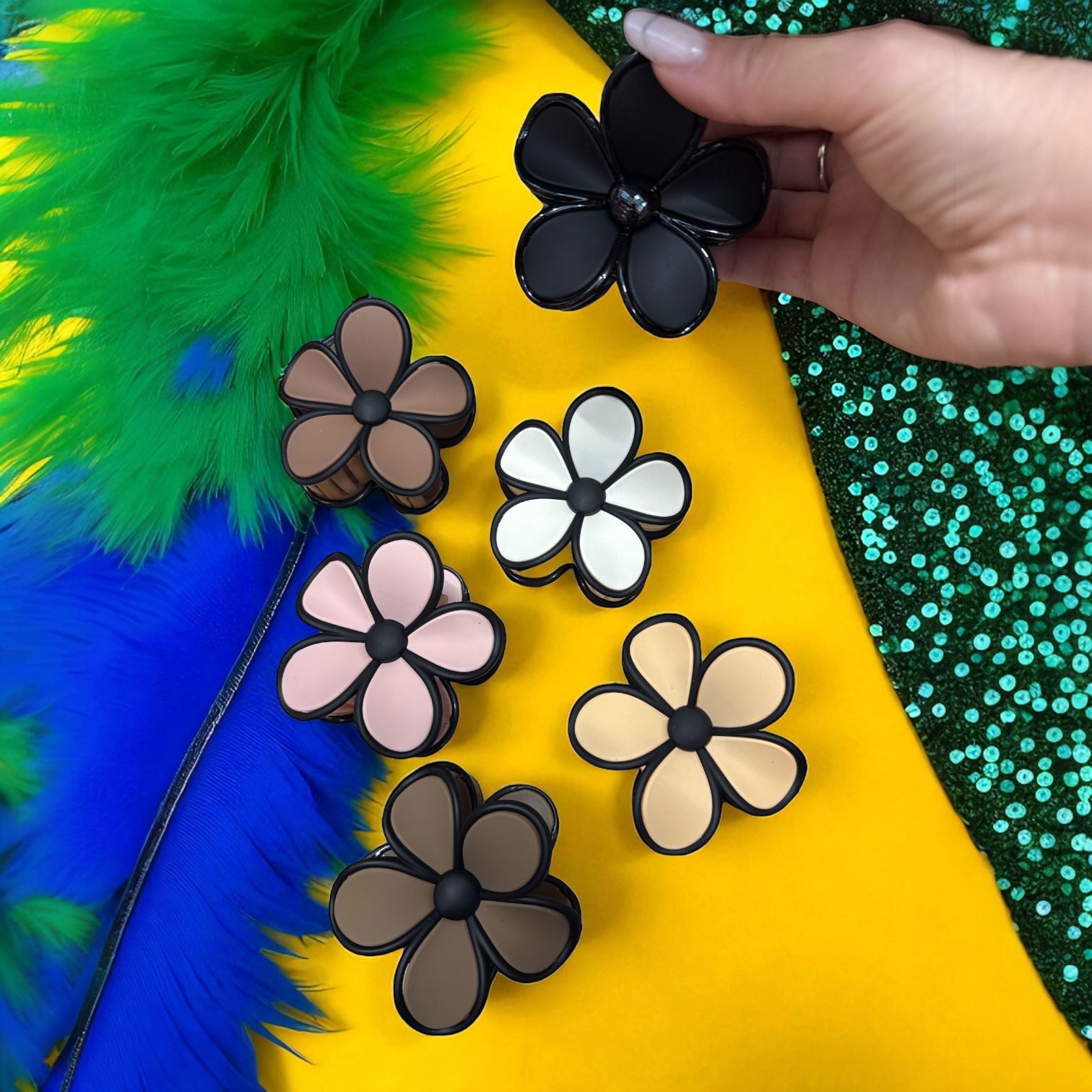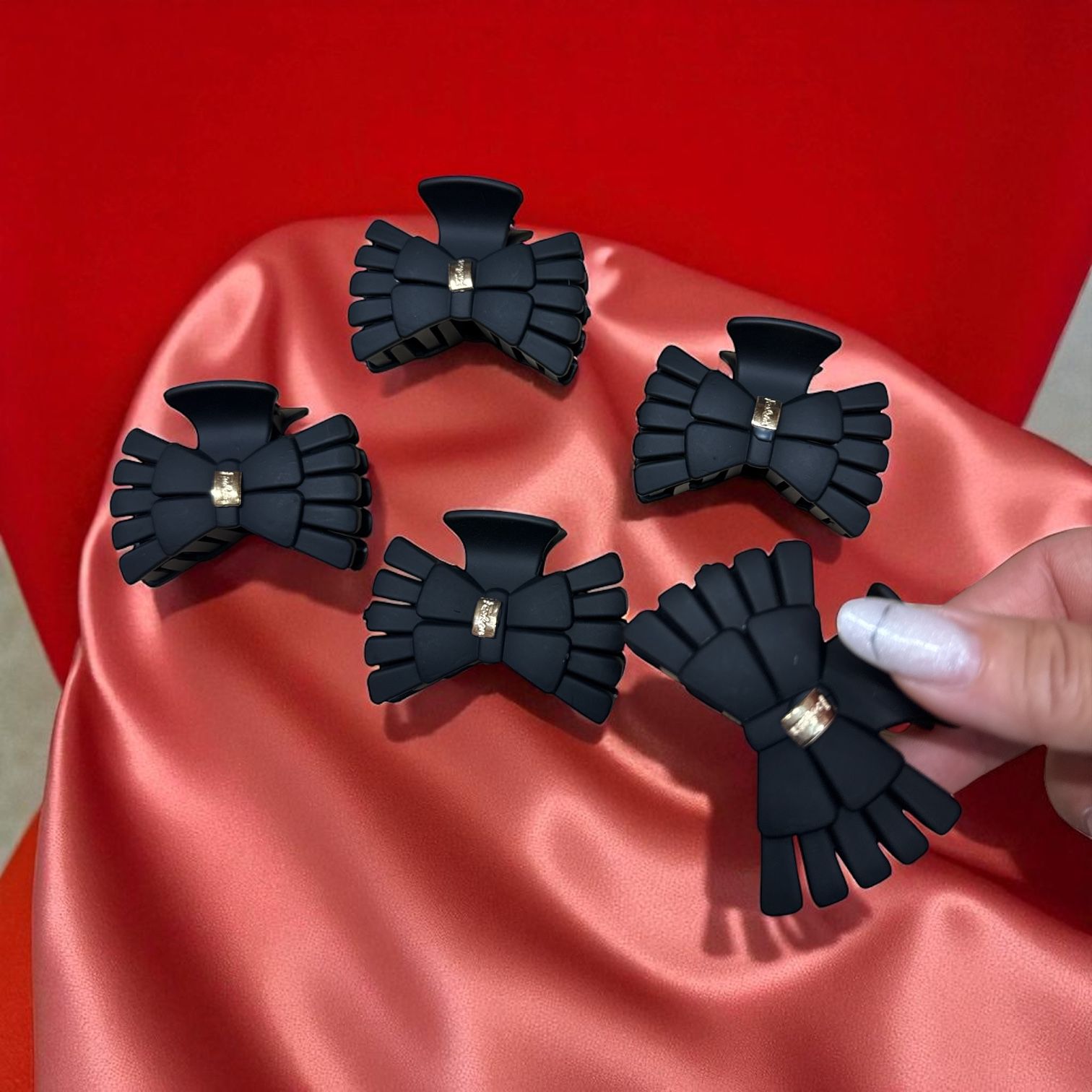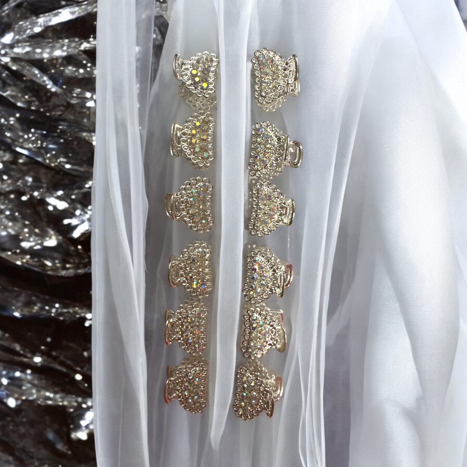 Acest set rafinat conține 12 mini clești de păr metalici, finisați într-un negru elegant, fiecare fiind împodobit cu cristale fațetate negre ce captează discret lumina. Designul lor este sofisticat, posibil floral sau cu o formă barocă stilizată, adăugând o notă de glamour și eleganță oricărei coafuri. Prezentanți de obicei în perechi, acești clești sunt perfecți pentru a adăuga detalii prețioase și un accent de strălucire coafurilor pentru ocazii speciale sau pentru a eleva un look de zi.