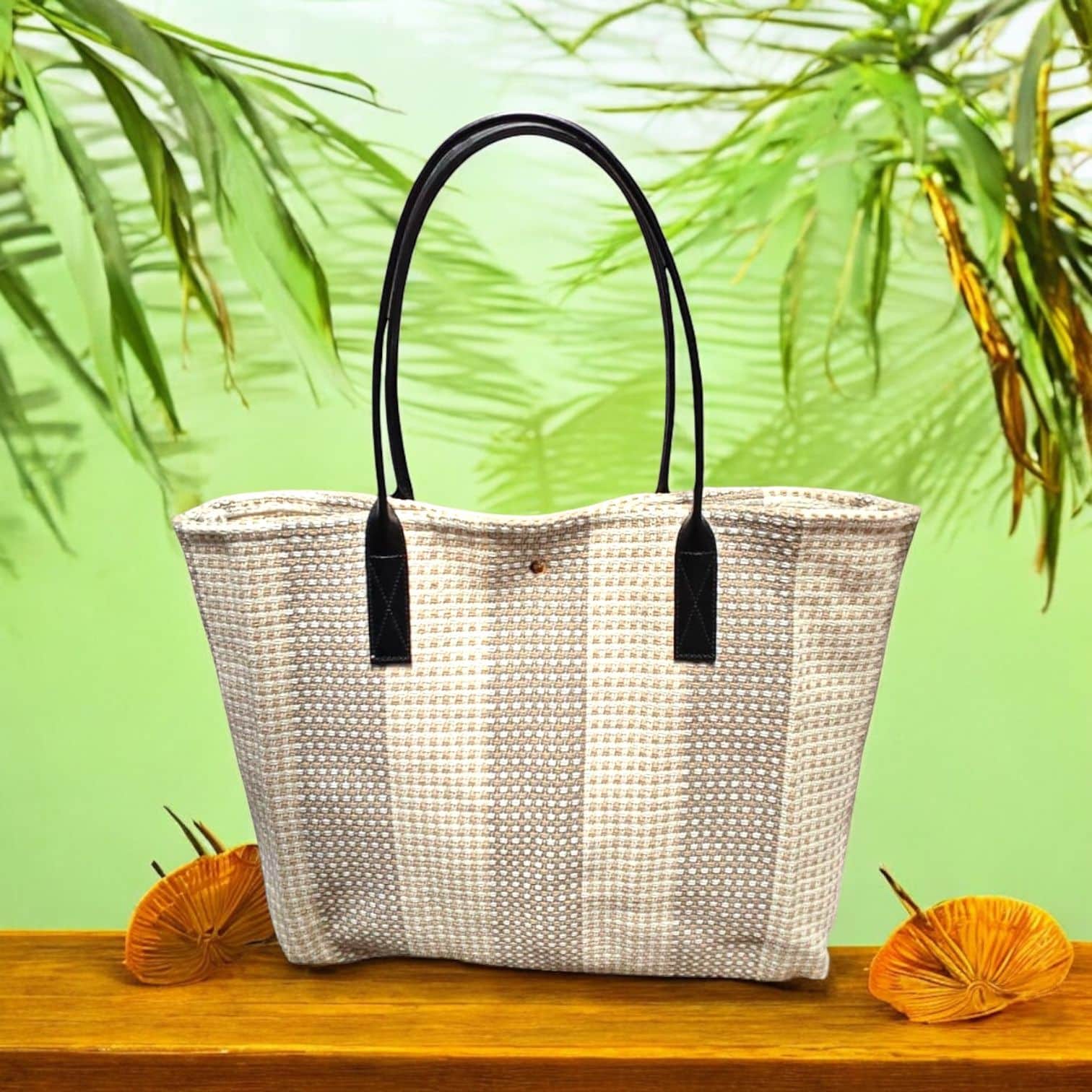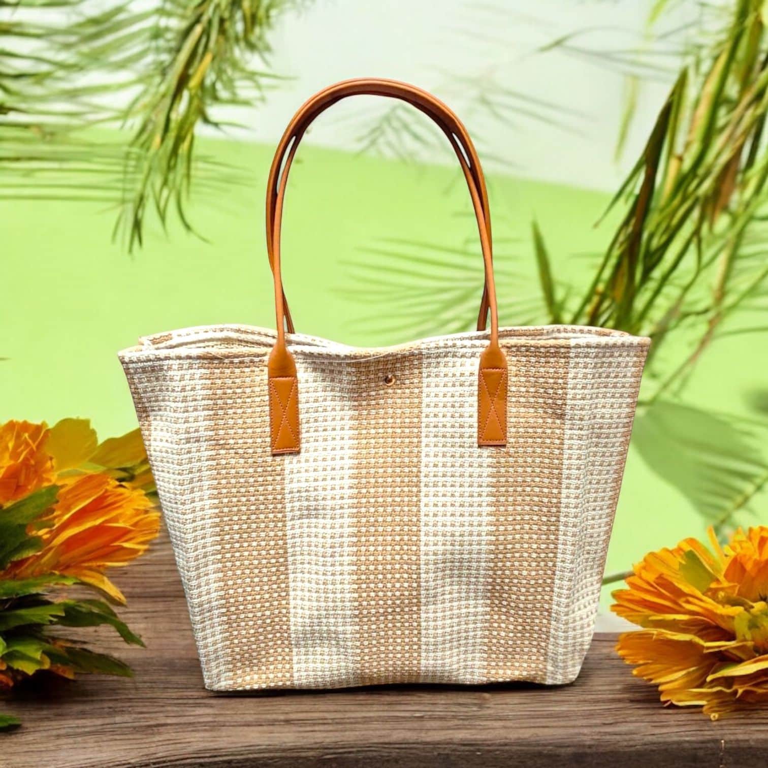 Geanta O229 este alegerea perfecta pentru tinute casual de vara, plaja sau iesiri in oras. Cu un design rafinat in dungi late bej si alb, aceasta geanta imbina stilul natural cu eleganta clasica. Manerele lungi, disponibile in varianta neagra sau maro, sunt confortabile si rezistente, iar interiorul generos permite transportul tuturor obiectelor esentiale.